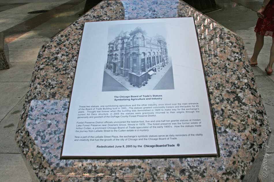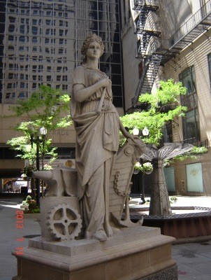 Lady Trade is 12 feet tall and weighs 5.5 tons. She and Lady Agriculture graced the entrance to the Chicago Board of Trade Building in 1885. Some 60+ years later while this building was demolished, these statues mysteriously disappeared. During 1978, the granite statues were uncovered in a Forest Preserve in a nearby county, some 25 miles away from the Chicago Board of Trade Building.* While the details of this discovery are not well-known, we can now enjoy the majesty the statues portray.